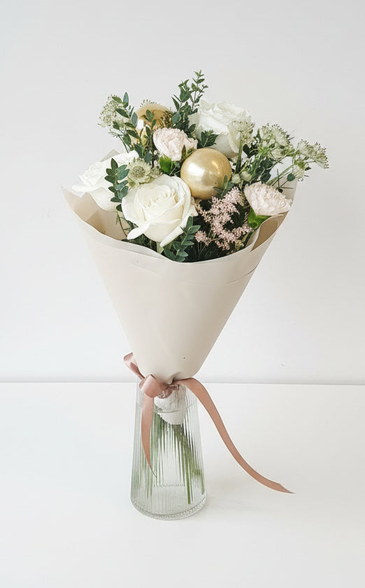 Ši puokštė spinduliuoja subtilų prabangos pojūtį – ne ryški, bet spindinti. Sodrios smėlinės, kreminės, aukso atspalvių gėlės derinamos su elegantiškais kalėdiniais akcentais: žaisliukais, sausintomis smulkmenomis, lengvais blizgučiais. Viskas kruopščiai sukomponuota, kad sukurtų šventinę, bet neperkrautą nuotaiką.