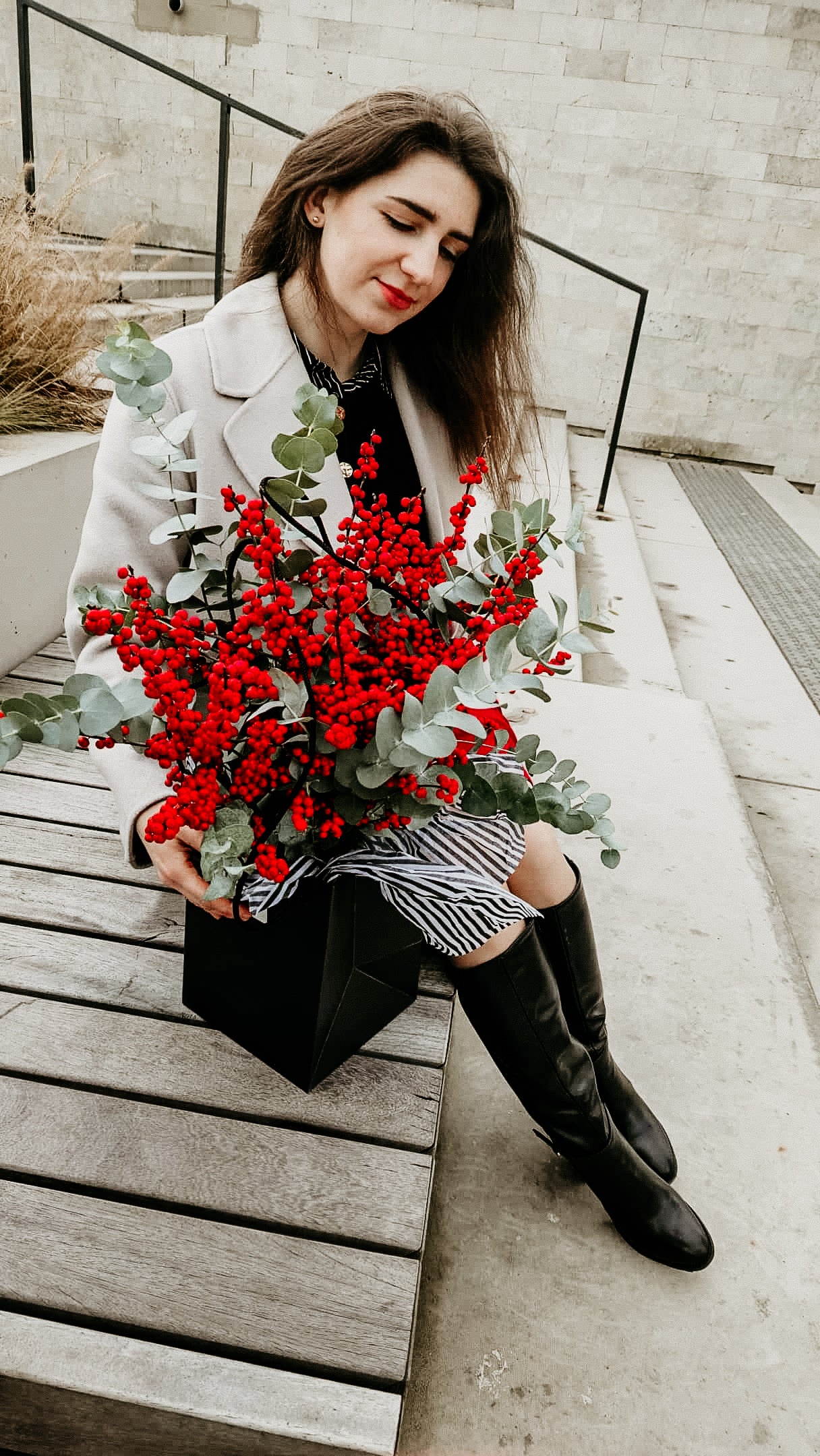 Ryškiai raudonos bugienio (Ilex) uogos ir eukalipto šakos sukuria ne tik šventinę, bet ir subtiliai jaukią nuotaiką. Puokštė įpakuota į baltą neperšlampantį popierių ir perrišta raudona juostele – kaip švelni dovana sau ar artimajam, kai norisi paprasto, bet išraiškingo dėmesio.