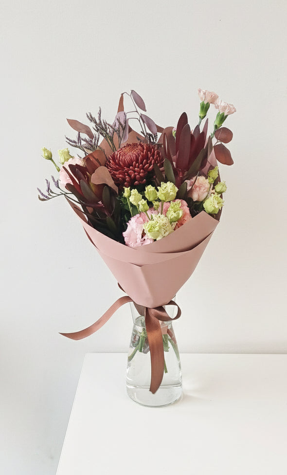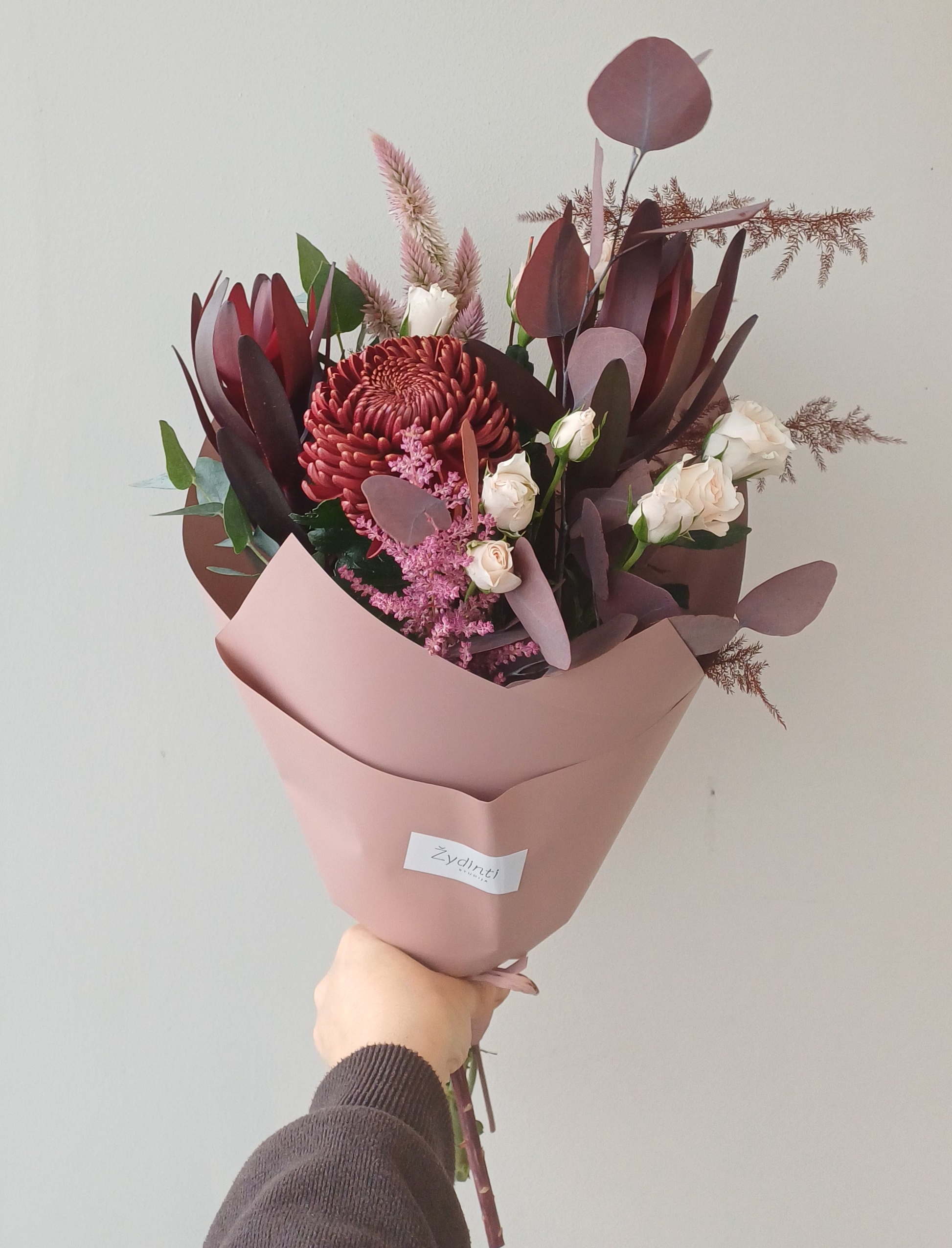 Tamsiai raudonos rožės, burgundiškos chrizantemos ir egzotiški leucodendrų akcentai kuria gilią, sodrią nuotaiką, primenančią šaltojo sezono jaukumą. Tai puokštė, kuri kalba už jus – apie meilę, stiprybę, pagarbą.