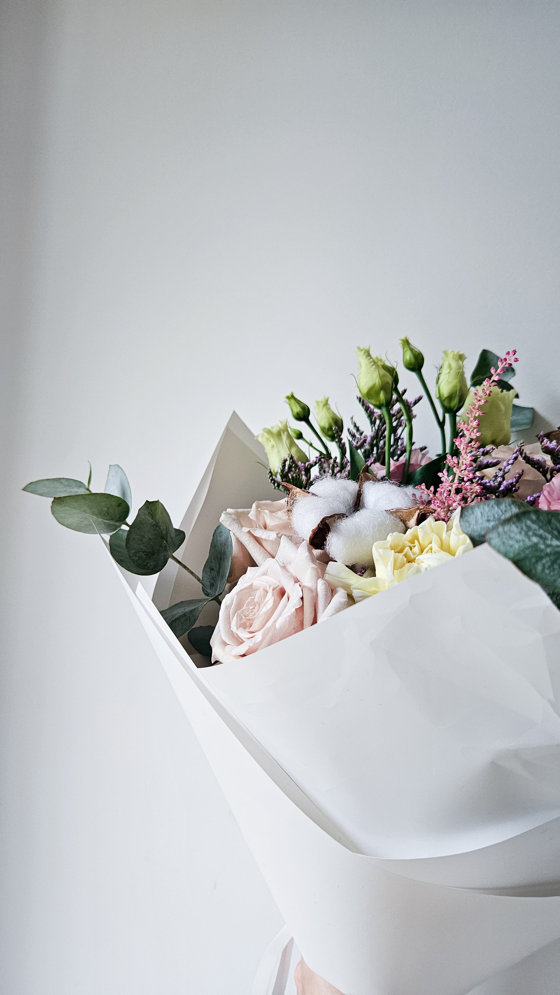 Ši puokštė – tarsi tyliai krintančių snaigių prisilietimas. Joje dera šviesių atspalvių gėlės ir purūs medvilnės burbuliukai, primenantys sniegą ant žiemos šakų. Subtili, švari ir rami kompozicija, puikiai tinkanti Kalėdoms ar dovanai žmogui, kuriam norisi perduoti švelnų rūpestį.